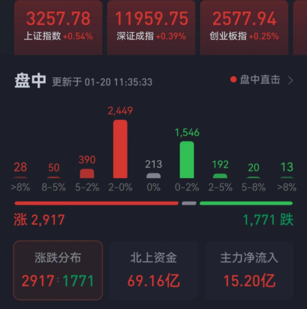 周五(1月20日),三大股指震蕩攀升,全線飄紅。截至上午收盤,上證指數(shù)漲幅達0.54%,報3257.78點;深證成指和創(chuàng)業(yè)板指漲幅分別為0.39%和0.25%;滬深兩市合計成交額4586.2億元,總體來看,兩市個股漲多跌少,其中,漲停個股達20只,跌停個股達6只。