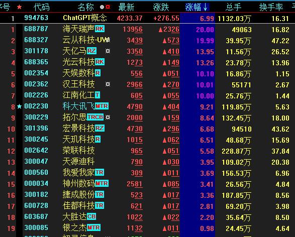 從今天的市場(chǎng)熱點(diǎn)板塊來看,ChatGPT概念板塊大幅飆升達(dá)6.99%,位居大智慧板塊的漲幅榜首位。其中,海天瑞聲、云從科技-UW、天娛數(shù)科、漢王科技、江南化工等多只概念股集體漲停。