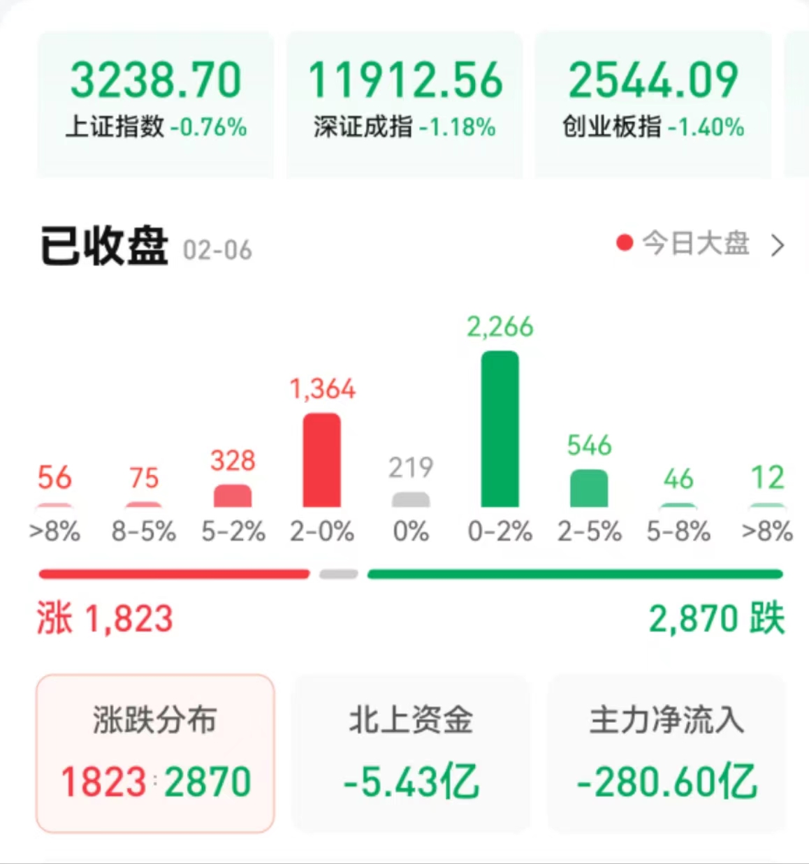 周一(2月6日),A股三大指數(shù)震蕩下行。截至收盤,上證指數(shù)跌0.76%報(bào)3238.7點(diǎn),深證成指跌1.18%報(bào)11912.56點(diǎn),創(chuàng)業(yè)板指跌1.40%報(bào)2544.09點(diǎn);兩市合計(jì)成交額達(dá)8747億元,北向資金凈賣出5.43億元,其中,滬股通凈買入13.14億元,深股通凈賣出18.57億元??傮w上看,兩市個(gè)股跌多漲少。