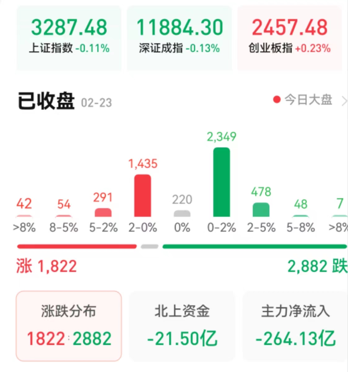 周四(2月23日),A股三大指數(shù)繼續(xù)震蕩分化。截至收盤,上證指數(shù)跌0.11%報3287.48點,深證成指跌0.13%報11884.3點,創(chuàng)業(yè)板指漲0.23%報2457.48點;兩市合計成交8073億元,北向資金凈賣出21.5億元??傮w上看,兩市個股跌多漲少。