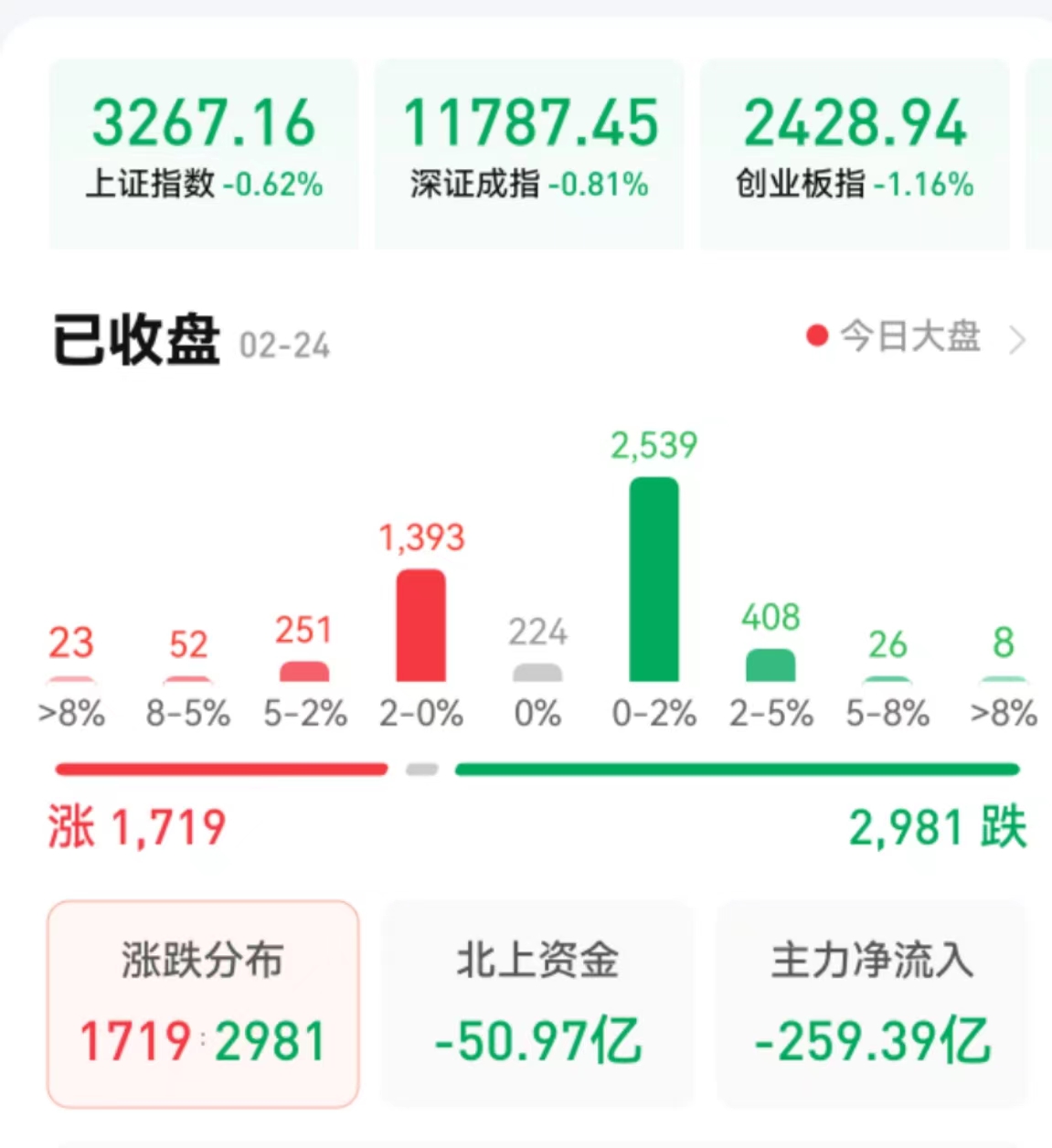 周五(2月24日),A股三大指數(shù)震蕩下探。截至收盤,上證指數(shù)跌0.62%報(bào)3267.16點(diǎn),深證成指跌0.82%報(bào)11787.45點(diǎn),創(chuàng)業(yè)板指跌1.16%報(bào)2428.94點(diǎn);兩市合計(jì)成交7258億元,北向資金凈賣出50.97億元。總體上看,兩市個(gè)股跌多漲少。其中,漲停個(gè)股達(dá)17只,跌停個(gè)股達(dá)6只。