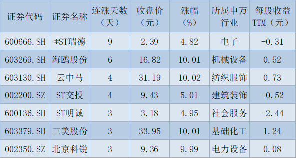 表:連續(xù)上漲3日且今日收盤漲停股一覽