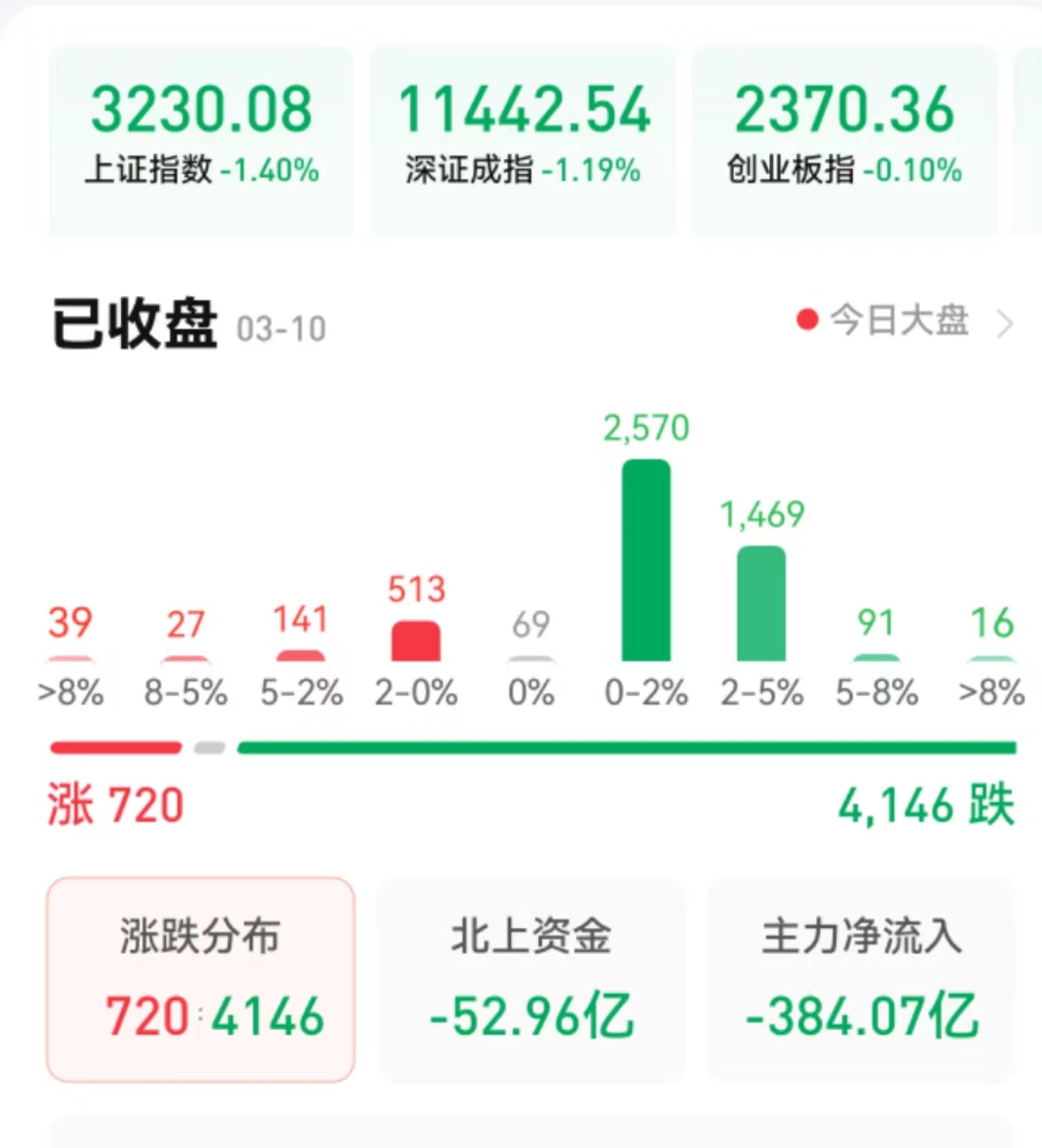 周五(3月10日),A股三大指數(shù)震蕩下行。截至收盤,上證指數(shù)跌1.4%報3230.07點,深證成指跌1.19%報11442.54點,創(chuàng)業(yè)板指跌0.1%報2370.36點;兩市合計成交金額達8096億元,北向資金凈賣出52.96億元??傮w上看,兩市個股跌多漲少,超4100只個股出現(xiàn)下跌。