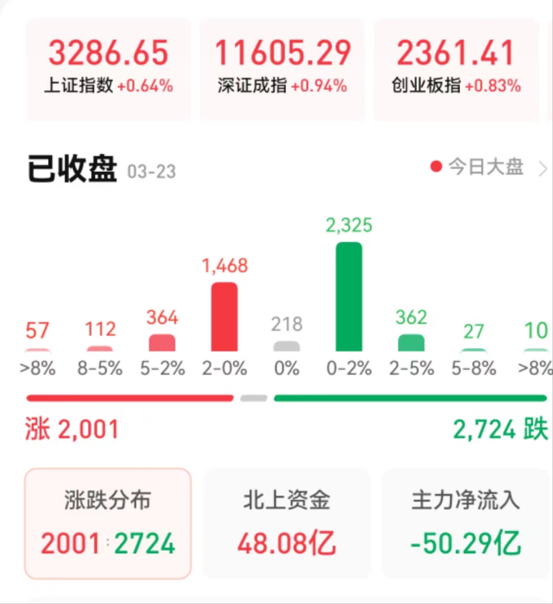 周四(3月23日),A股三大指數(shù)震蕩上行,全線飄紅。截至收盤,上證指數(shù)漲0.64%報3286.65點,深證成指漲0.94%報11605.29點,創(chuàng)業(yè)板指漲0.83%報2361.41點;兩市合計成交金額達(dá)10207億元??傮w上看,兩市個股跌多漲少。其中,漲停個股達(dá)27只,跌停個股達(dá)5只。