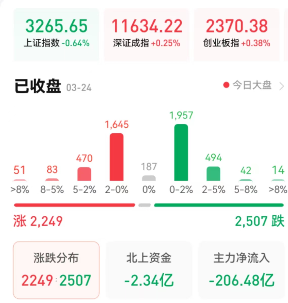 周五(3月24日),A股三大指數(shù)震蕩分化,漲跌不一。截至收盤,上證指數(shù)跌0.64%報(bào)3265.65點(diǎn),深證成指漲0.25%報(bào)11634.22點(diǎn),創(chuàng)業(yè)板指漲0.38%報(bào)2370.38點(diǎn);兩市合計(jì)成交金額達(dá)10748億元,連續(xù)第2個(gè)交易日成交額突破萬億元,北向資金凈賣出2.34億元。總體上看,兩市個(gè)股跌多漲少。其中,漲停個(gè)股達(dá)30只,跌停個(gè)股達(dá)6只。
