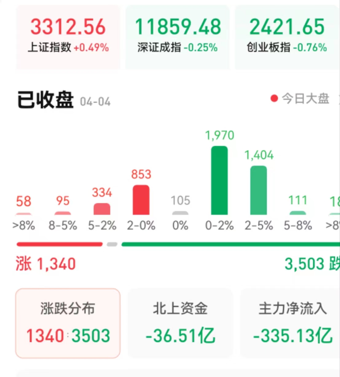 周二(4月4日),A股三大股指震蕩分化。截至收盤,上證指數(shù)漲0.49%,報(bào)3312.56點(diǎn);深證成指跌0.25%,報(bào)11859.48點(diǎn);創(chuàng)業(yè)板指跌0.76%,報(bào)2421.65點(diǎn)。兩市合計(jì)成交額13246億元,連續(xù)第2個(gè)交易日突破萬(wàn)億元;北向資金凈賣出36.51億元;總體來(lái)看,A股個(gè)股跌多漲少,其中,漲停個(gè)股達(dá)26只,跌停個(gè)股達(dá)8只。