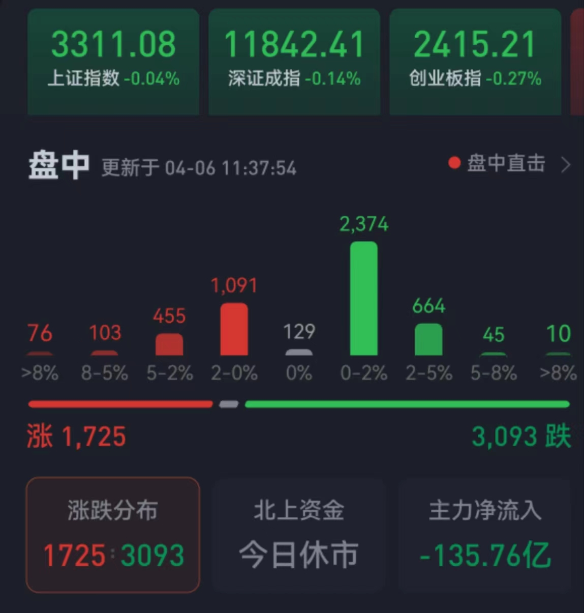 周四(4月6日),三大股指震蕩整理,略有回落。截至上午收盤,上證指數(shù)跌幅達(dá)0.04%,報3311.08點;深證成指和創(chuàng)業(yè)板指跌幅分別為0.14%和0.27%;滬深兩市合計成交額7257.9億元,總體來看,兩市個股跌多漲少。