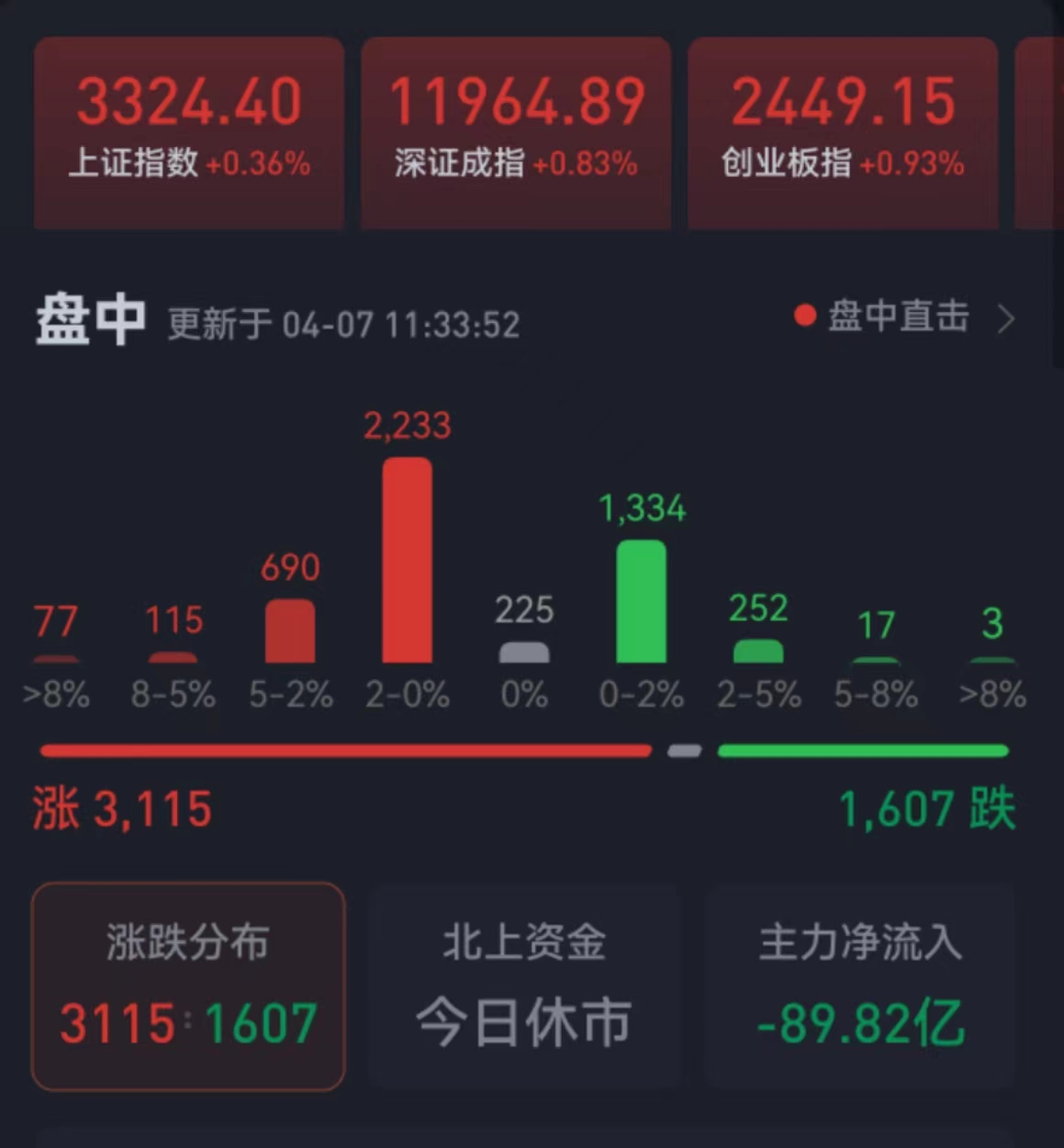 周五(4月7日),三大股指繼續(xù)震蕩上漲,全線飄紅。截至上午收盤,上證指數(shù)漲幅達0.36%,報3324.40點;深證成指和創(chuàng)業(yè)板指漲幅分別為0.83%和0.93%;滬深兩市合計成交額6652.4億元,總體來看,兩市個股漲多跌少。其中,超3100家公司實現(xiàn)上漲。