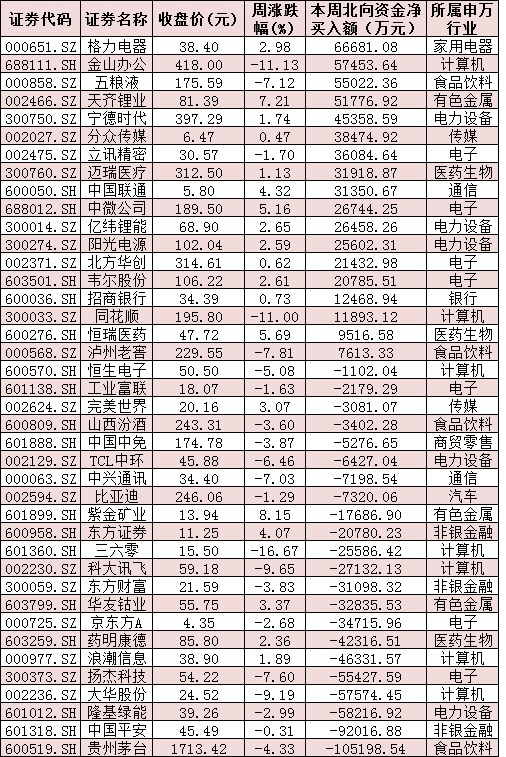 資金方面,本周北向資金累計凈買入金額達47.56億元。從前十大成交活躍股來看,本周,格力電器、金山辦公、五糧液、天齊鋰業(yè)等4只個股,北向資金凈買入金額均超5億元。另外,貴州茅臺、中國平安等個股遭北向資金凈賣出金額均超9億元。