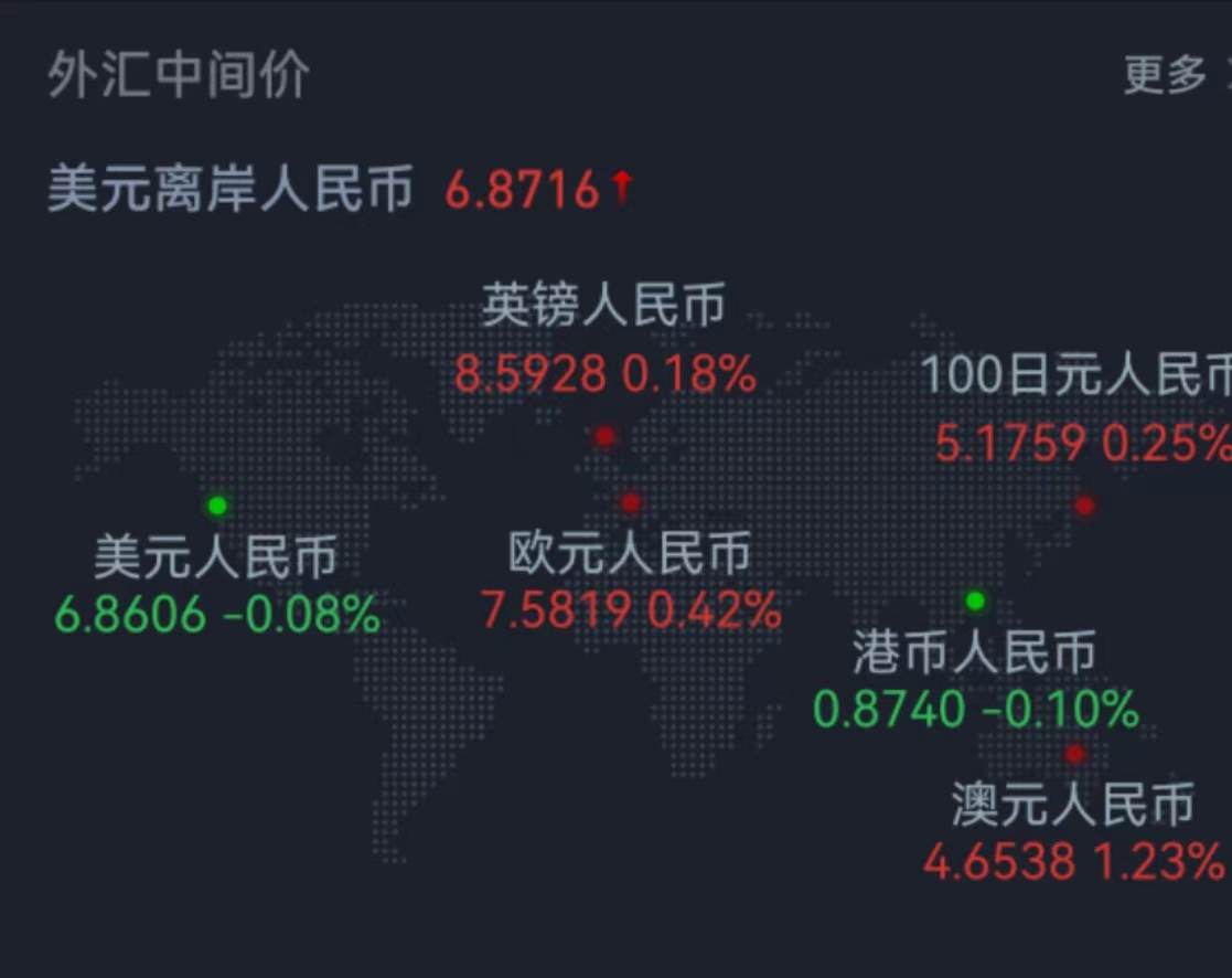 周五在岸人民幣兌美元16:30收盤報6.8495,較上一交易日漲226個基點,周漲259個基點。人民幣兌美元中間價報6.8606,調(diào)升52個基點,本周累計調(diào)升232個基點。在岸人民幣兌美元夜盤收報6.8690。