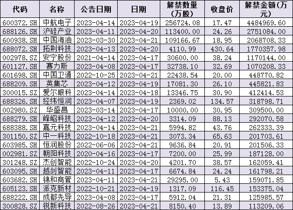 與此同時,統(tǒng)計顯示,下周(4月17日—21日)共有54家公司限售股陸續(xù)解禁,按最新收盤價計算,解禁市值為1779.43億元。從解禁市值來看,中航電子(448.5億元)、滬硅產(chǎn)業(yè)(275.11億元)、中國海油(206.87億元)、拓荊科技-U(177.01億元)、安寧股份(117.01億元)、賽力斯(107.02億元)等公司解禁金額均超100億元。