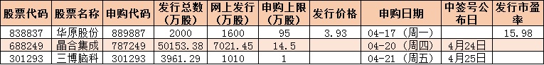 根據(jù)發(fā)行安排,下周(4月17日—21日)有3只新股發(fā)行,其中創(chuàng)業(yè)板1只,科創(chuàng)板1只,北交所1只。分別為華原股份、晶合集成、三博腦科。