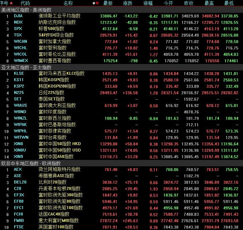 周五,美國三大股指全線收跌,道指跌0.42%報33886.47點,標(biāo)普500指數(shù)跌0.21%報4137.64點,納指跌0.35%報12123.47點。本周,道指漲1.2%,標(biāo)普500指數(shù)漲0.79%,納指漲0.29%。