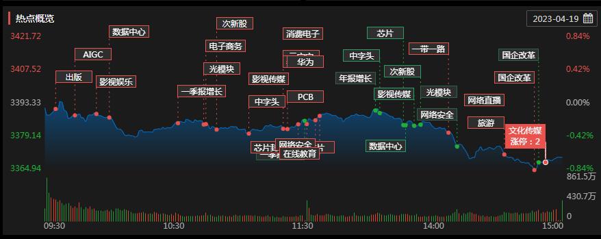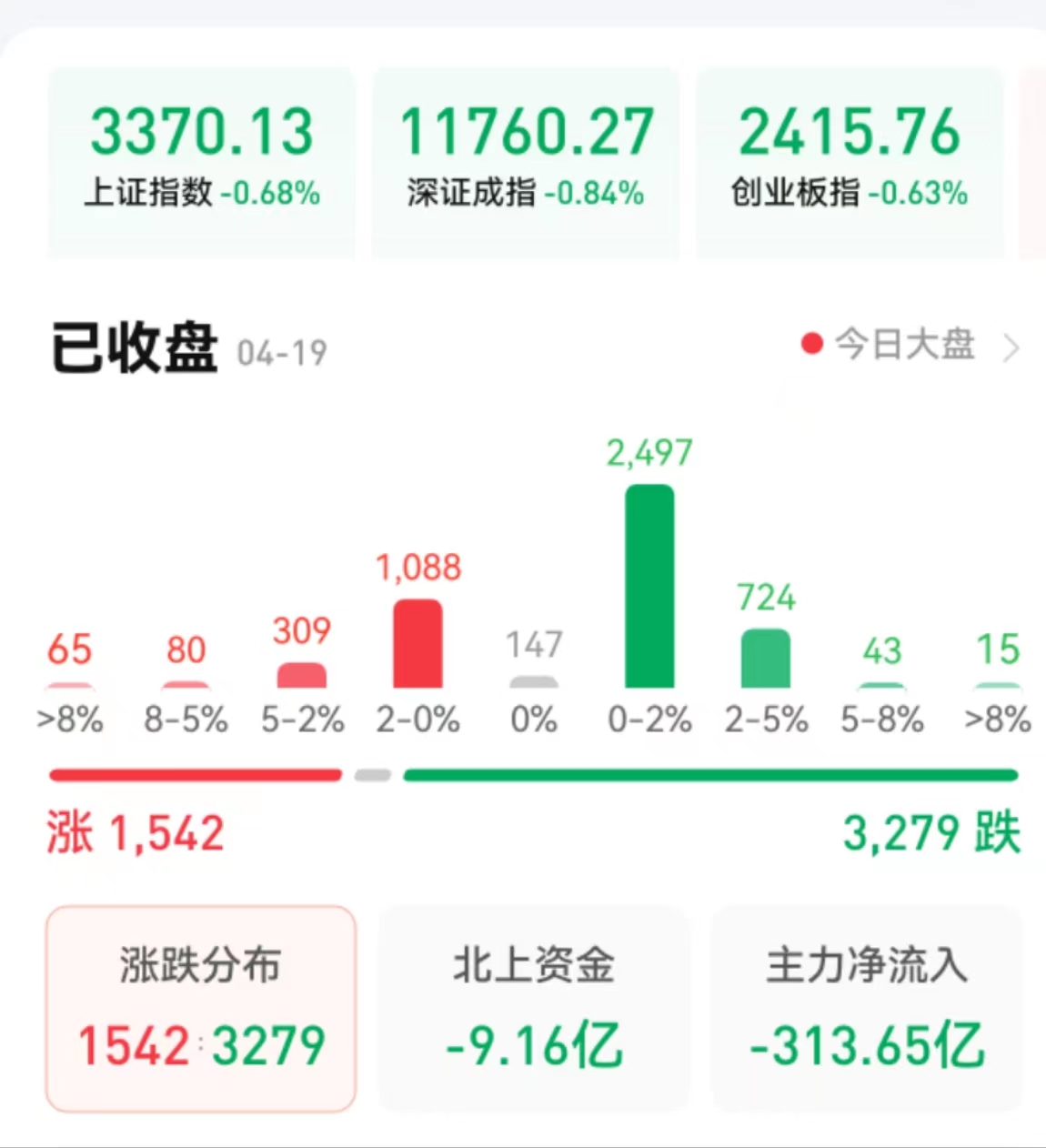 周三(4月19日),A股三大股指震蕩回落。截至收盤,上證指數(shù)跌0.68%,報3370.13點;深證成指跌0.84%,報11760.27點;創(chuàng)業(yè)板指跌0.63%,報2415.76點。滬深兩市合計成交額10826.26億元,連續(xù)第12個交易日突破萬億元;北向資金凈賣出9.16億元;總體來看,A股個股跌多漲少,其中,漲停個股達(dá)32只,跌停個股達(dá)18只。