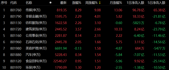4月28日,行業(yè)漲多跌少,從31類申萬一級行業(yè)看,有29類行業(yè)上漲,占比93.55%,傳媒漲幅居首,達8.29%,周漲幅與月漲幅同樣居首,分別高達9.08%和13.06%;此外,建筑裝飾、非銀金屬和石油石化等3行業(yè)漲幅均超2%。下跌方面,僅電力設(shè)備和美容護理微跌0.21%和0.13%。