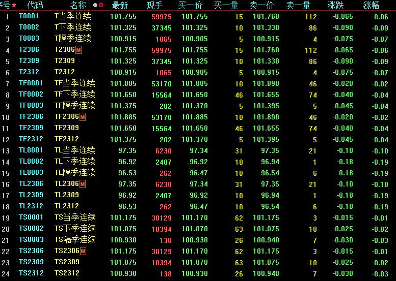 5月12日,國(guó)債期貨全線收跌,30年期主力合約跌0.10%,10年期主力合約跌0.06%,5年期主力合約跌0.02%,2年期主力合約跌0.01%。全周來(lái)看,30年期主力合約本周跌0.10%,10年期主力合約漲0.10%,5年期主力合約漲0.14%,2年期主力合約漲0.04%。