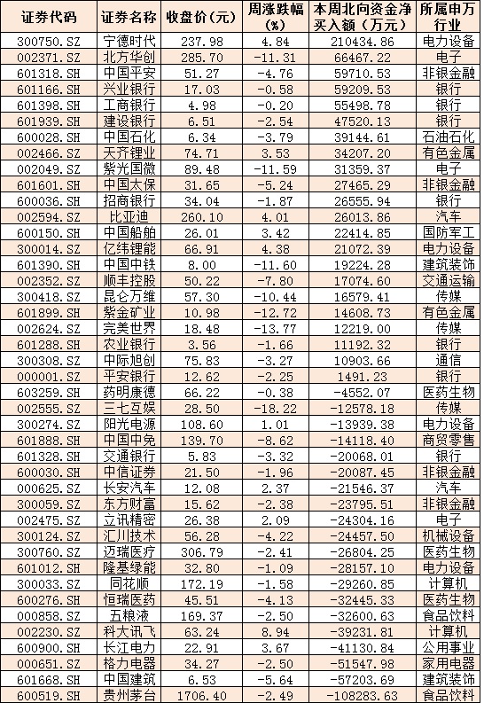資金方面,本周北向資金累計(jì)凈買入金額達(dá)99.60億元。從前十大成交活躍股來(lái)看,本周,寧德時(shí)代、北方華創(chuàng)、中國(guó)平安、興業(yè)銀行、工商銀行等5只個(gè)股,北向資金凈買入金額均超5億元。另外,貴州茅臺(tái)、中國(guó)建筑、格力電器等個(gè)股遭北向資金凈賣出金額均超5億元。