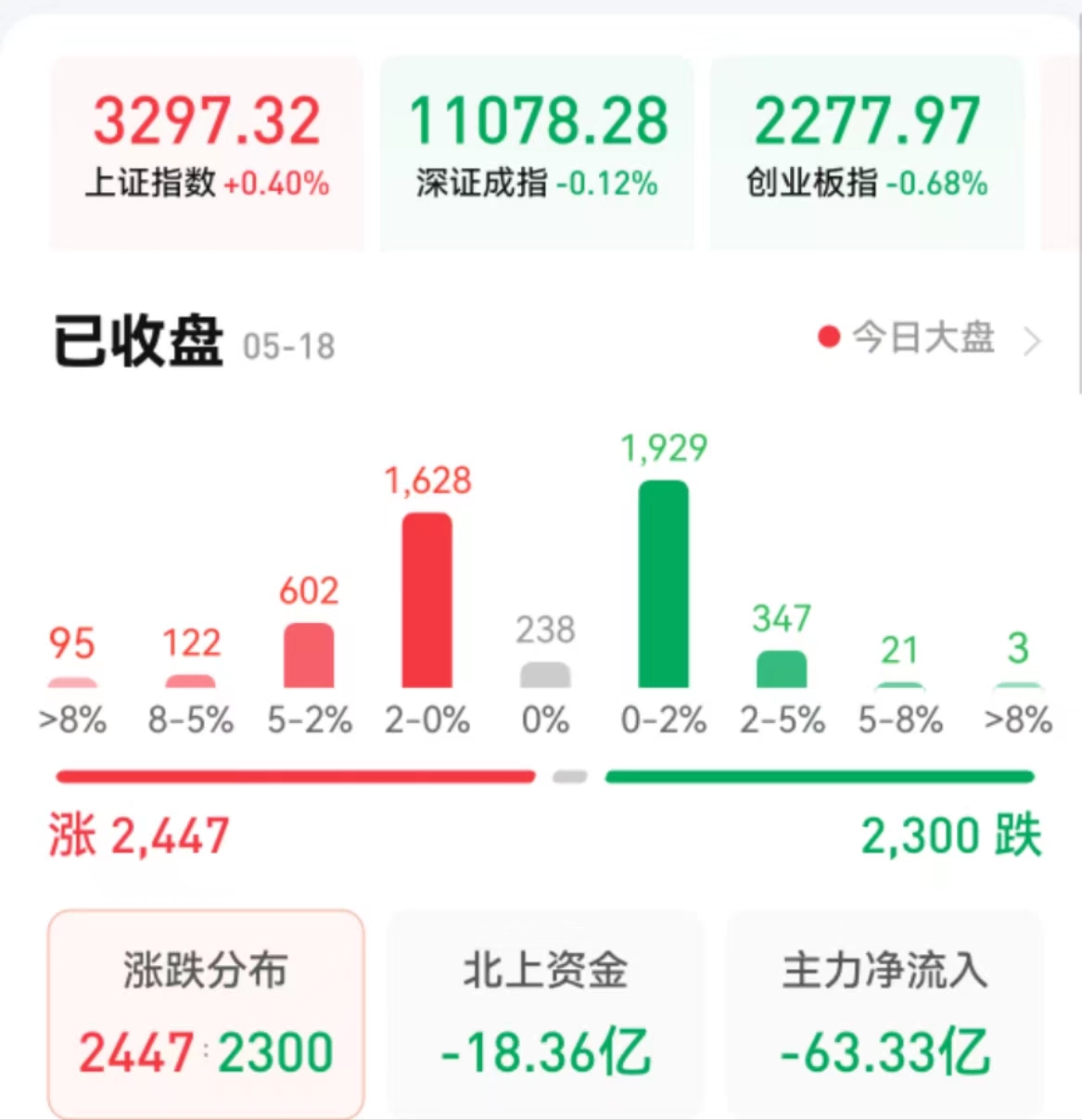 周四(5月18日),A股三大股指震蕩分化,漲跌不一。截至收盤,上證指數(shù)漲0.4%報3297.32點,深證成指跌0.12%報11078.28點,創(chuàng)業(yè)板指跌0.68%報2277.97點,科創(chuàng)50指數(shù)漲0.5%;兩市合計成交8799億元,北向資金凈賣出18.36億元??傮w上看,兩市個股漲多跌少。其中,漲停個股達49只,跌停個股達21只。