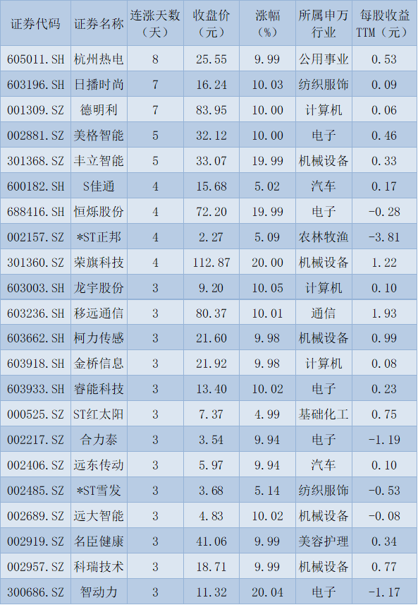 表:連續(xù)上漲3日且今日收盤漲停股一覽