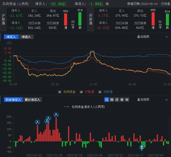 5月19日,A股三大指數(shù)集體低開,個股活躍,深證成指和創(chuàng)業(yè)板指表現(xiàn)強(qiáng)勢,滬指早盤翻紅后午盤未能保持強(qiáng)勢。截至收盤,上證指數(shù)跌0.42%報3283.54點(diǎn);深證成指漲0.12%報11091.36點(diǎn),創(chuàng)業(yè)板指漲0.03%報2278.59點(diǎn),A股合計成交額8498.62億元,較前一交易日縮減3.67%;北向資金全天凈賣出22.26億元;其中滬股通凈買入-22.43億元,深股通凈買入0.17億元。今日A股上漲股略多,有2510只上漲,2479只下跌。