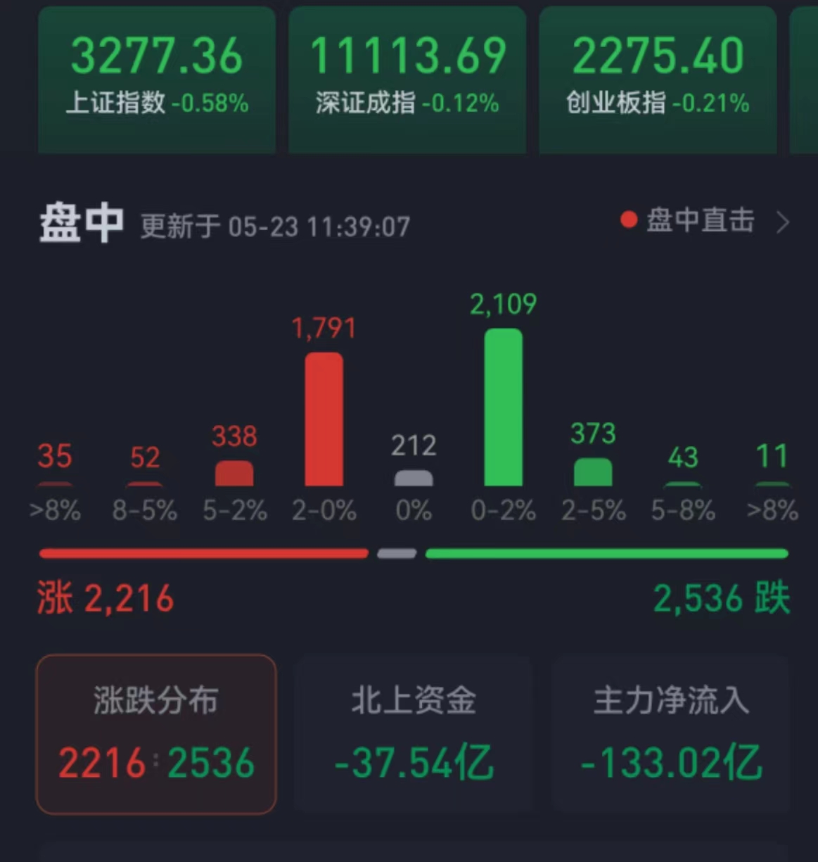 周二(5月23日),三大股指震蕩回落。截至上午收盤,上證指數(shù)跌幅達(dá)0.58%,報3277.36點;深證成指跌幅達(dá)0.12%,創(chuàng)業(yè)板指漲幅為0.21%;滬深兩市合計成交額4782億元,總體來看,兩市個股跌多漲少。