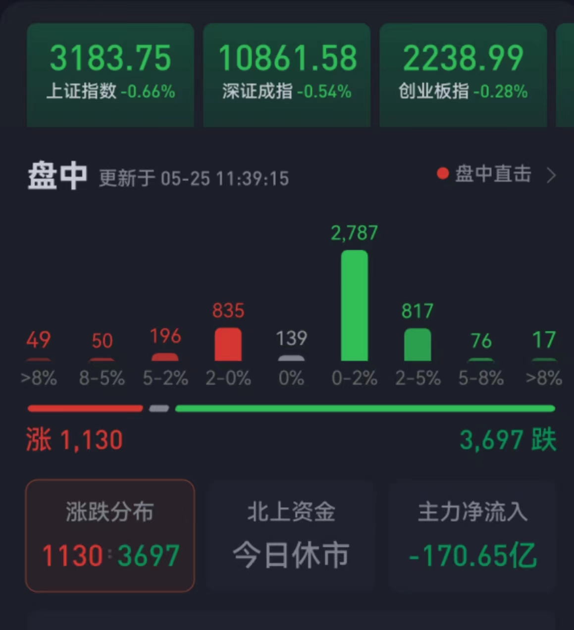 周四(5月25日),三大股指震蕩回落。截至上午收盤,上證指數(shù)跌幅0.66%,報3183.75點;深證成指和創(chuàng)業(yè)板指跌幅分別為0.54%和0.28%;滬深兩市合計成交額5375.6億元,總體來看,兩市個股跌多漲少。