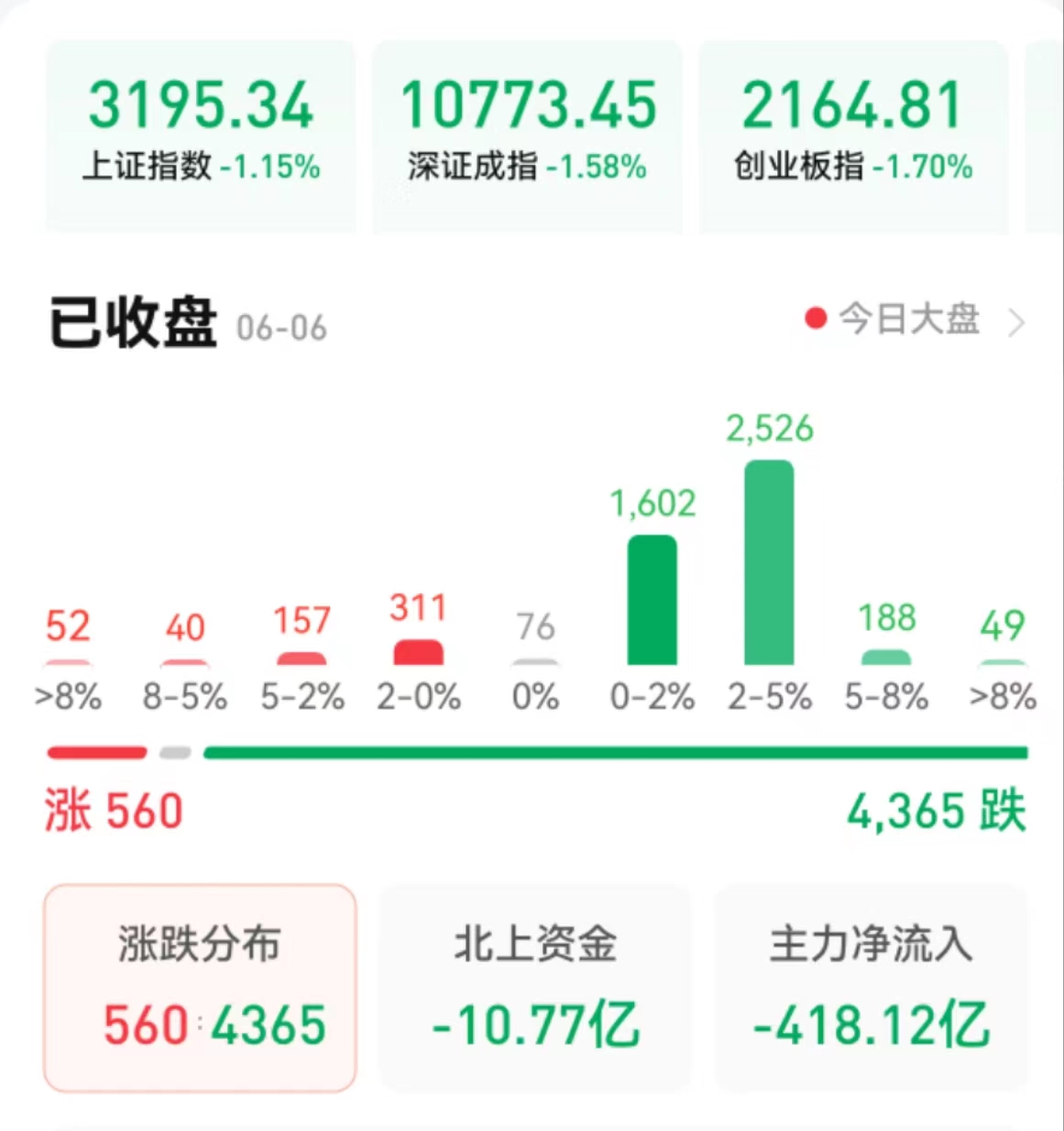 周二(6月6日),A股三大股指震蕩回落,全線下跌。截至收盤,上證指數(shù)跌1.15%報(bào)3195.34點(diǎn),深證成指跌1.58%報(bào)10773.45點(diǎn),創(chuàng)業(yè)板指跌1.70%報(bào)2164.81點(diǎn);兩市合計(jì)成交9375億元,北向資金凈賣出10.77億元??傮w上看,兩市個(gè)股跌多漲少。其中,漲停個(gè)股達(dá)50只,跌停個(gè)股達(dá)19只。