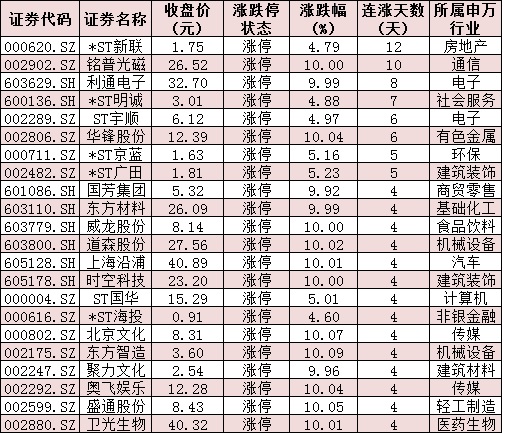 表:連續(xù)上漲4日且今日收盤漲停個(gè)股情況: