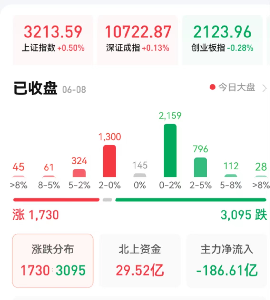 周四(6月8日),A股三大股指震蕩整理,漲跌不一。截至收盤,上證指數(shù)漲0.5%報3213.59點,深證成指漲0.13%報10722.87點,創(chuàng)業(yè)板指跌0.28%報2123.96點;兩市合計成交8596億元,北向資金凈買入29.52億元??傮w上看,兩市個股跌多漲少。其中,漲停個股達39只,跌停個股達18只。
