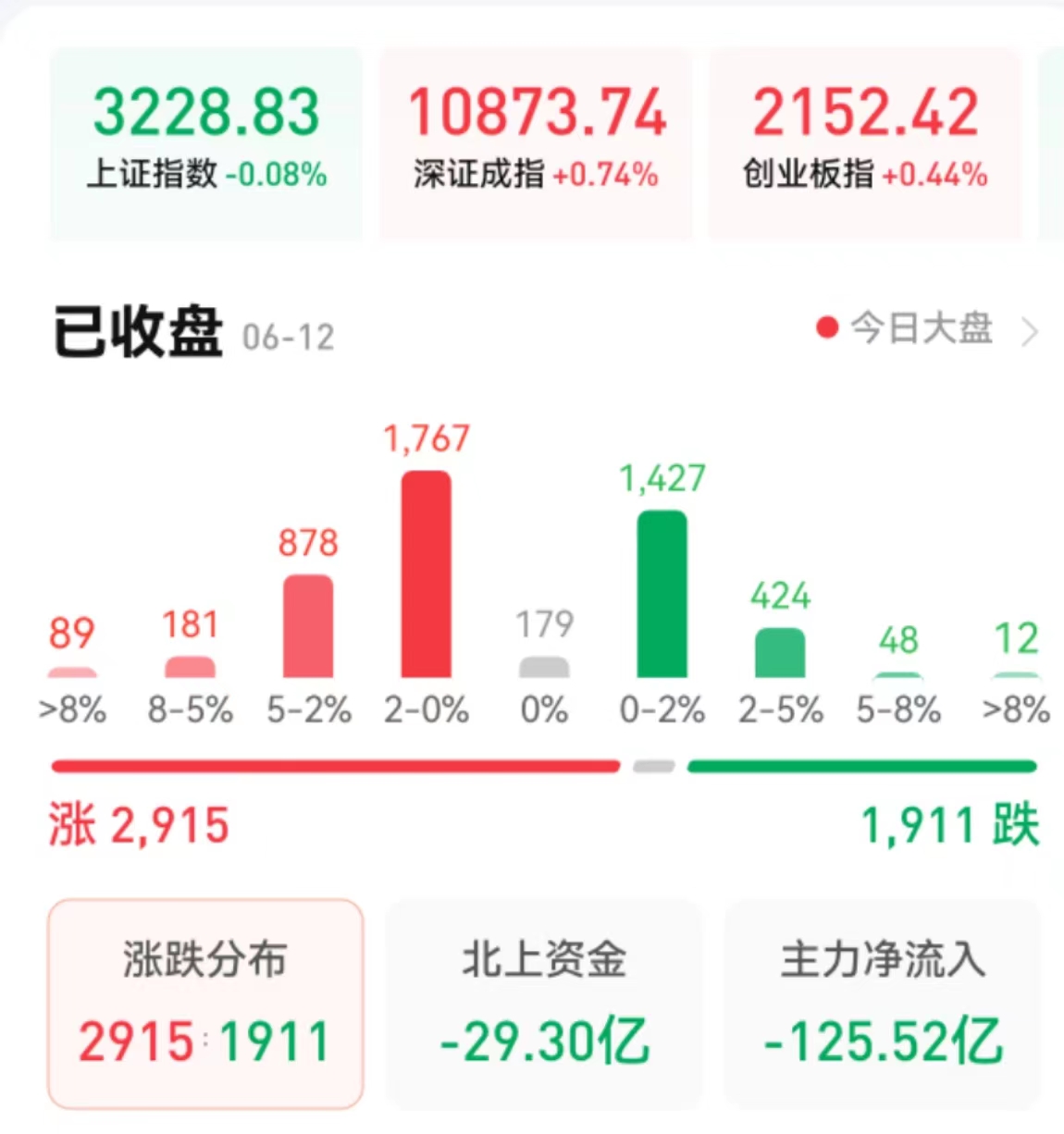 周一(6月12日),A股三大股指震蕩分化,漲跌不一。截至收盤,上證指數(shù)跌0.08%報(bào)3228.83點(diǎn),深證成指漲0.74%報(bào)10873.74點(diǎn),創(chuàng)業(yè)板指漲0.44%報(bào)2152.42點(diǎn);兩市合計(jì)成交9654億元,北向資金凈賣出29.3億元??傮w上看,兩市個(gè)股漲多跌少。其中,漲停個(gè)股達(dá)71只,跌停個(gè)股達(dá)13只。