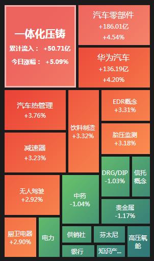 具體熱點(diǎn)板塊方面,今日,一體化壓鑄板塊領(lǐng)漲,文燦股份等6只概念股漲停;汽車零部件板塊集體走強(qiáng),躍嶺股份等20只個(gè)股漲停,資金凈流入達(dá)186.01億元;華為汽車、汽車熱管理、EDR概念、減速器、無(wú)人駕駛等板塊表現(xiàn)活躍。高壓氧艙板塊領(lǐng)跌,知識(shí)產(chǎn)權(quán)保護(hù)、銀行、貴金屬、電力、供銷社、中藥等板塊跌幅居前。