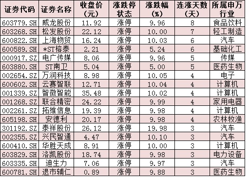 表:連續(xù)上漲3日且今日收盤漲停個(gè)股情況: