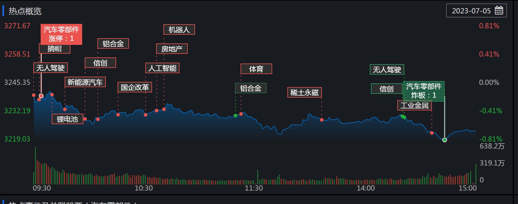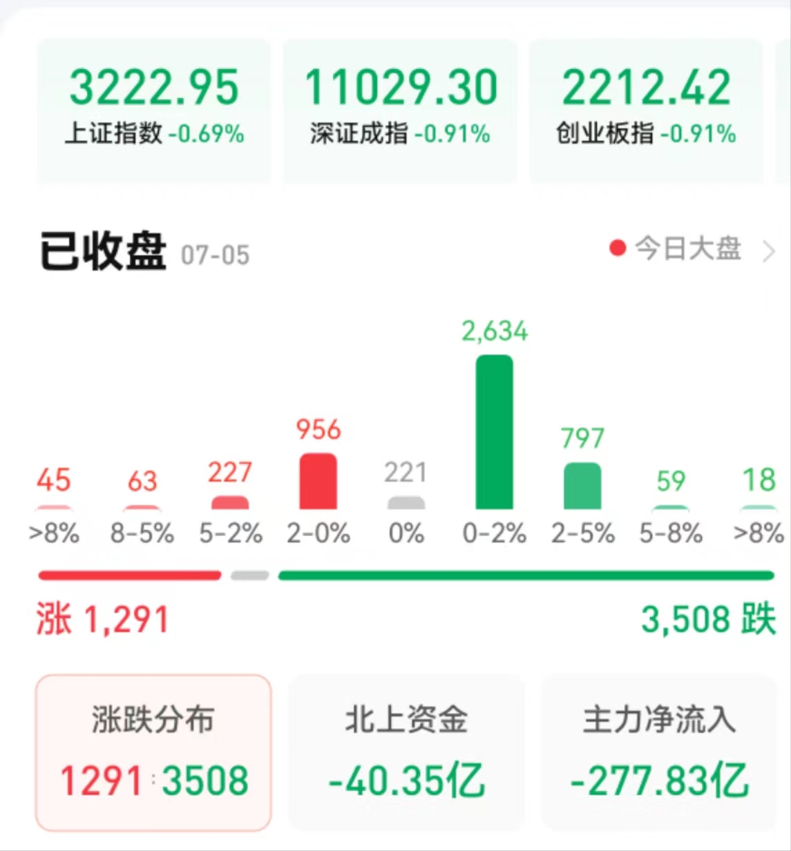 周三(7月5日),A股三大股指震蕩回落。截至收盤,上證指數(shù)跌0.69%報3222.95點,深證成指跌0.91%報11029.3點,創(chuàng)業(yè)板指跌0.91%報2212.42點;兩市合計成交金額達8678億元,北向資金凈賣出40.35億元??傮w上看,兩市個股跌多漲少。其中,漲停個股達34只,跌停個股達8只。