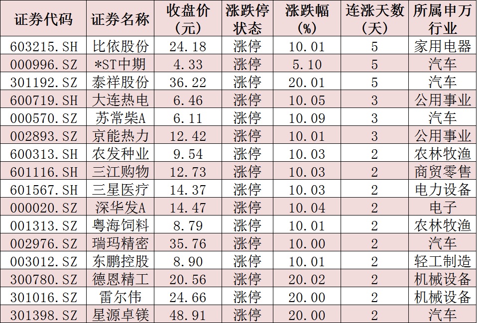 表:連續(xù)上漲2日且今日收盤漲停個股情況: