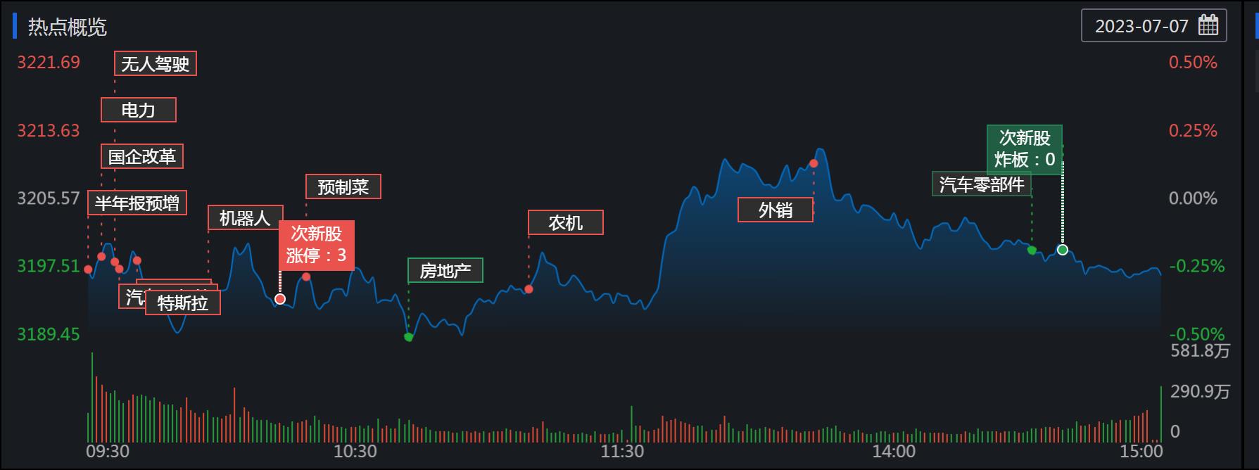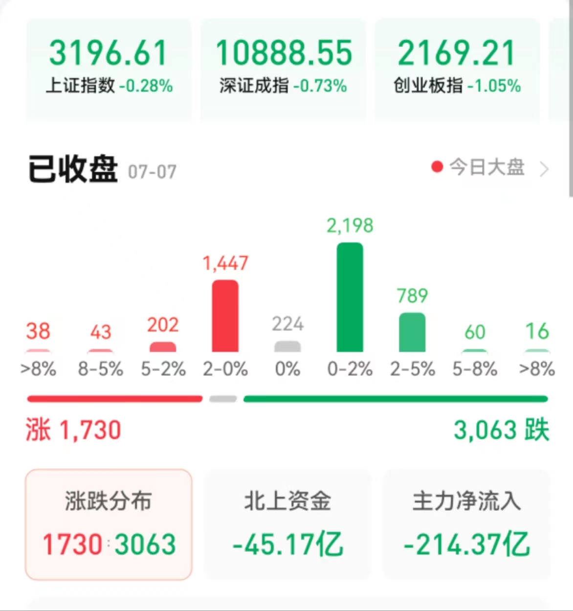 周五(7月7日),A股三大股指震蕩下行。截至收盤,上證指數(shù)跌0.28%報3196.61點(diǎn),深成指跌0.73%報10888.55點(diǎn),創(chuàng)業(yè)板指跌1.05%報2169.21點(diǎn);兩市合計成交金額達(dá)7998億元,北向資金凈賣出45.17億元??傮w上看,兩市個股跌多漲少,下跌個股超3000只,其中,漲停個股達(dá)27只,跌停個股達(dá)9只。
