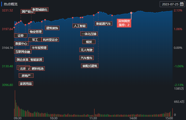 7月25日,A股受利好消息影響,三大指數(shù)高開,房地產(chǎn)與非銀金融等板塊強勢崛起,市場人氣有所恢復。截至收盤,上證指數(shù)漲2.13%報3231.52點;深證成指漲2.54%報11021.29點,創(chuàng)業(yè)板指漲2.14%報2192.90點。A股合計成交額9490.90億元,較前一交易日增長43.81%;北向資金全天凈買入189.83億元;其中滬股通凈買入98.79億元,深股通凈買入91.05億元。今日A股有4414只上漲,716只下跌,漲跌比為6.16。