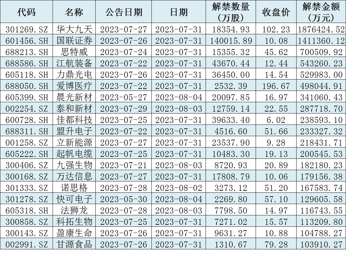 與此同時,據(jù)同花順統(tǒng)計顯示,下周(7月31日-8月4日)共有53家公司限售股陸續(xù)解禁,按最新收盤價計算,解禁市值為881.34億元。從解禁市值來看,華大九天(187.64億元)、國聯(lián)證券(141.14億元)等公司解禁金額均超140億元。