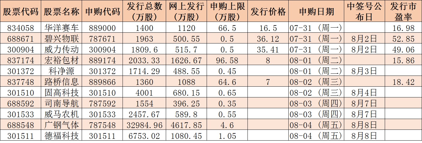 根據(jù)發(fā)行安排,下周有11只新股發(fā)行,7月31日發(fā)行的是威力傳動、碧興物聯(lián)、華洋賽車;8月1日發(fā)行的是科凈源、宏裕包材;8月2日發(fā)行的是固高科技、路橋信息;8月3日發(fā)行的是司南導(dǎo)航、威馬農(nóng)機(jī);8月4日發(fā)行的是廣鋼氣體、德福科技。