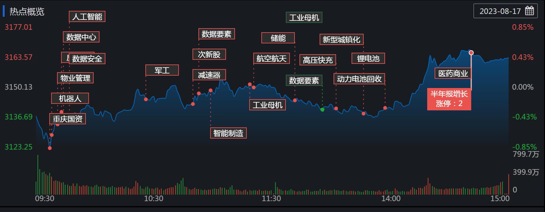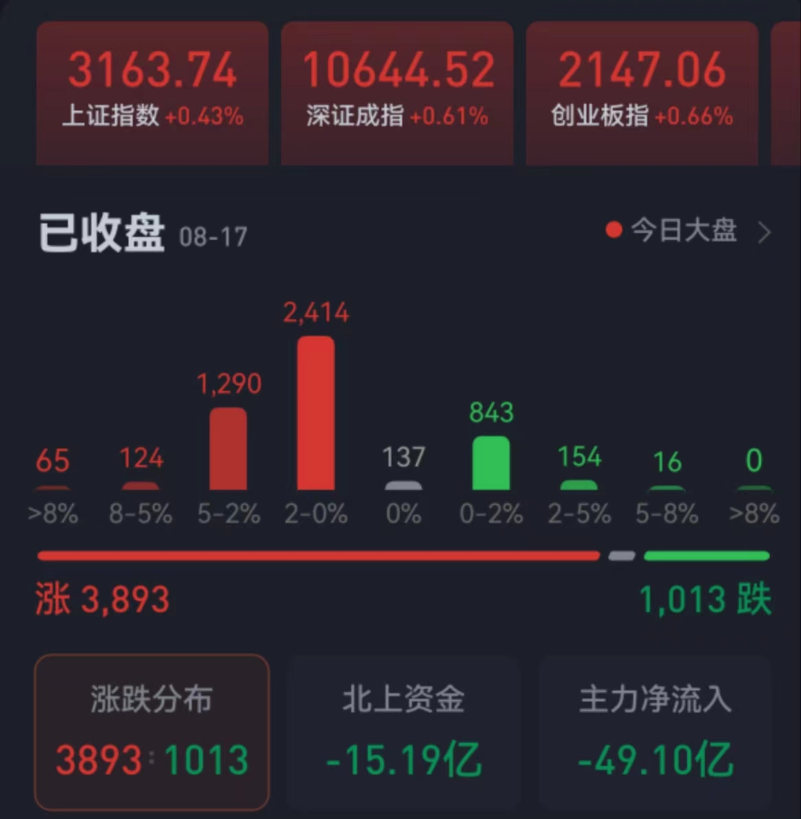 周四(8月17日),A股三大股指震蕩上行,全線飄紅。截至收盤,上證指數(shù)漲0.43%報(bào)3163.74點(diǎn),深證成指漲0.61%報(bào)10644.52點(diǎn),創(chuàng)業(yè)板指漲0.66%報(bào)2147.06點(diǎn)。兩市合計(jì)成交金額7398.19億元,北向資金凈賣出15.19億元??傮w上看,兩市個(gè)股漲多跌少,近4000只個(gè)股上漲。其中,漲停個(gè)股達(dá)43只,跌停個(gè)股1只。