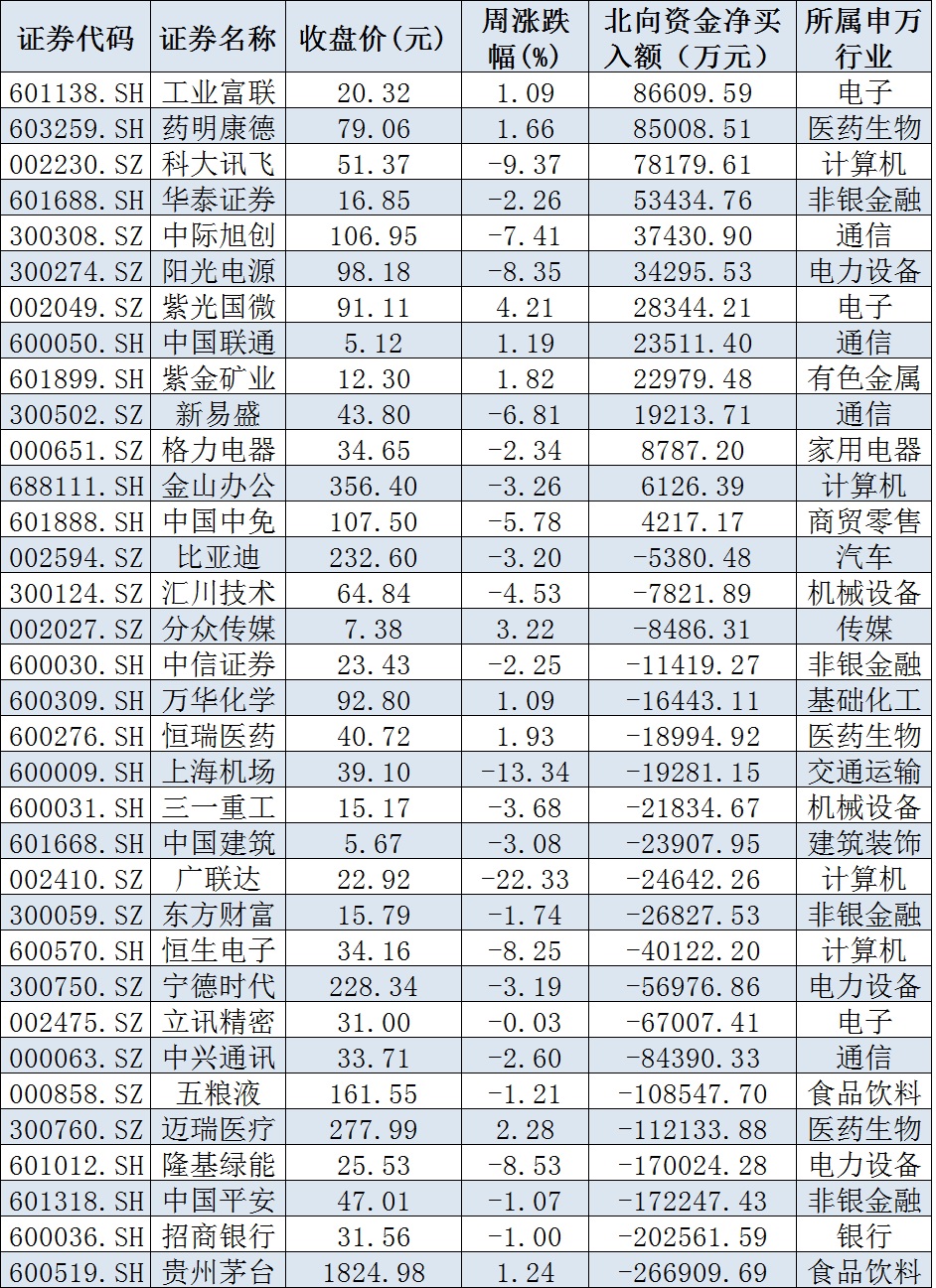 資金方面,本周北向資金累計(jì)凈賣出金額達(dá)224.20億元。從前十大成交活躍股來看,本周,工業(yè)富聯(lián)、藥明康德、科大訊飛等3只個(gè)股,北向資金凈買入金額均超7億元。另外,貴州茅臺(tái)、招商銀行、中國平安、隆基綠能等個(gè)股遭北向資金凈賣出金額均超17億元。