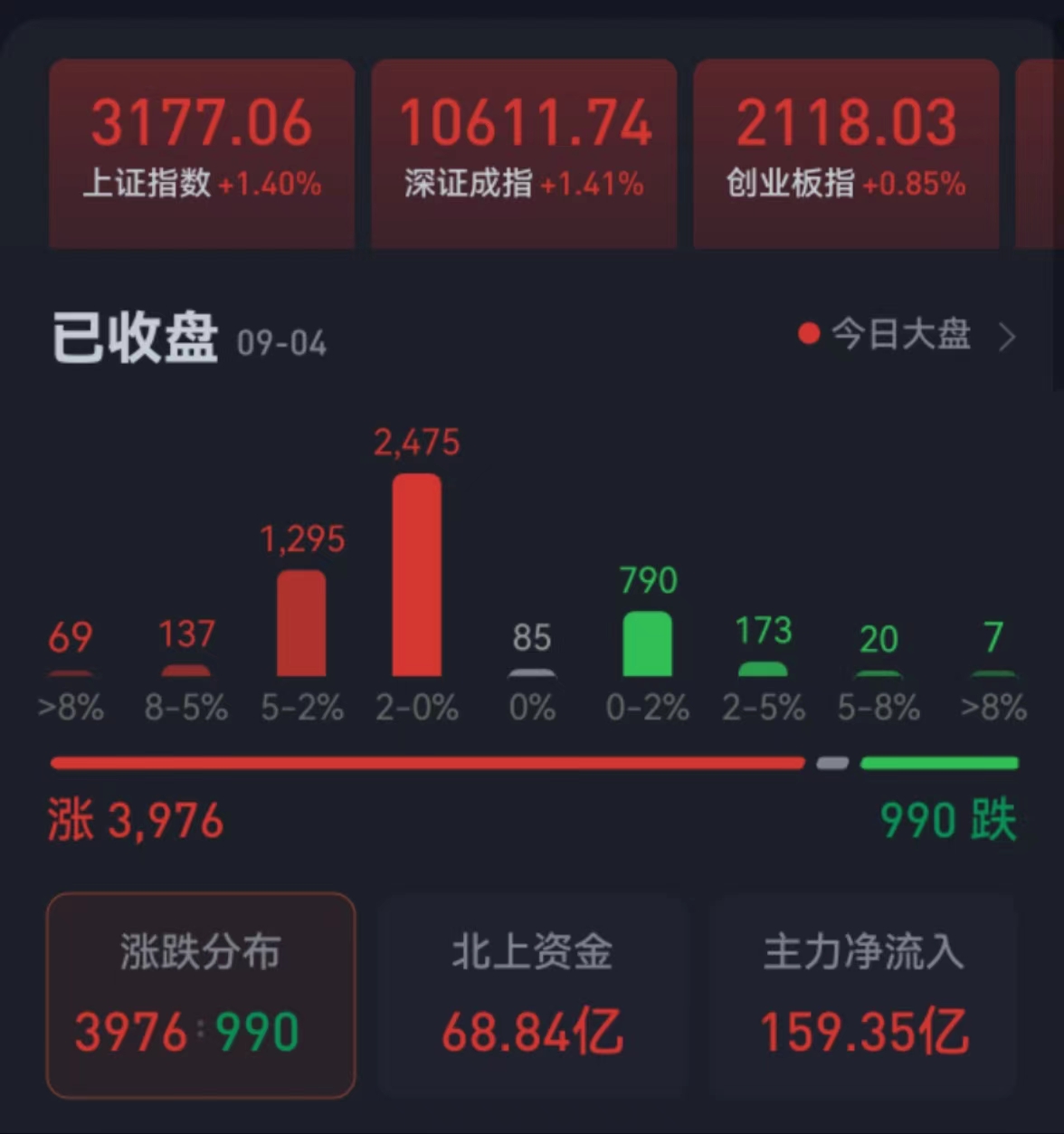 周一(9月4日),A股三大股指震蕩上行,全線飄紅。截至收盤(pán),上證指數(shù)漲1.40%,收?qǐng)?bào)3177.06點(diǎn);深證成指漲1.41%,收?qǐng)?bào)10611.74點(diǎn);創(chuàng)業(yè)板指漲0.85%,收?qǐng)?bào)2118.03點(diǎn)。滬深兩市合計(jì)成交額達(dá)8848.61億元,北向資金凈買(mǎi)入68.84億元??傮w上看,兩市個(gè)股漲多跌少,近4000只個(gè)股上漲。其中,漲停個(gè)股達(dá)57只,跌停個(gè)股達(dá)2只。