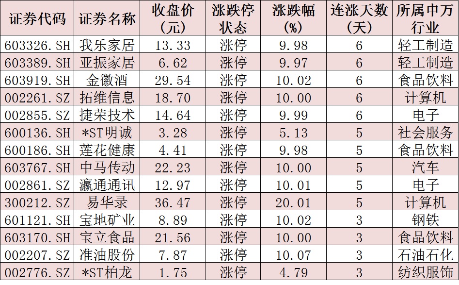 表:連續(xù)上漲3日且今日收盤(pán)漲停個(gè)股情況: