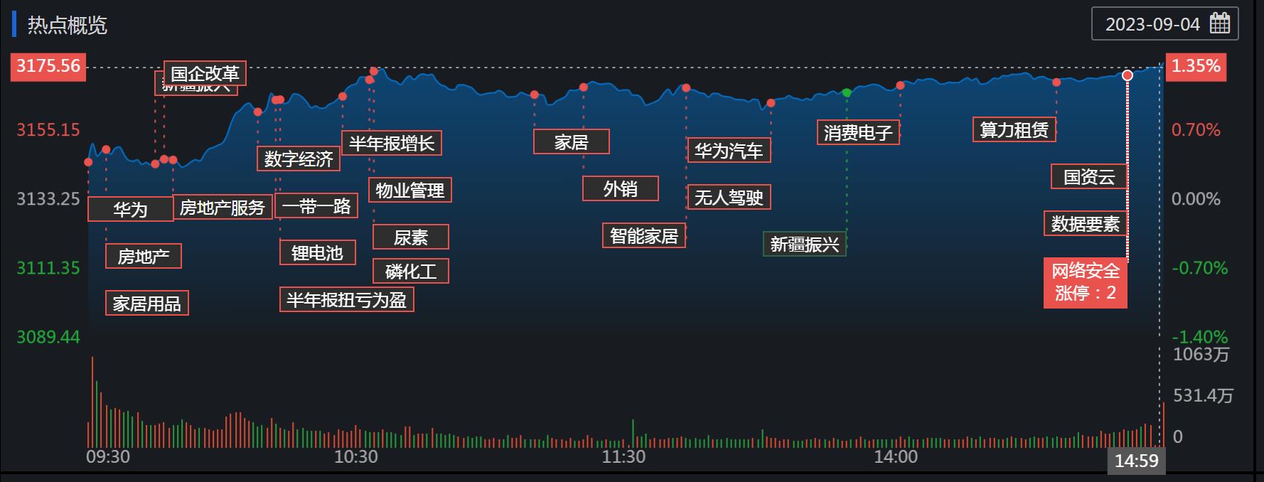 具體熱點(diǎn)來(lái)看,今日,房地產(chǎn)服務(wù)板塊領(lǐng)漲,世聯(lián)行、新大正、我愛(ài)我家漲停;小金屬股全天強(qiáng)勢(shì),吉翔股份、安寧股份漲停;鋼鐵板塊震蕩上行,寶地礦業(yè)漲停;白酒概念延續(xù)漲勢(shì),金徽酒漲停;煤炭概念盤(pán)中異動(dòng),云煤能源漲停;另有華為歐拉、可燃冰、家用輕工、鈦白粉概念、金屬鋅等板塊表現(xiàn)活躍。僅芬太尼、科創(chuàng)次新股、注冊(cè)制次新股、醫(yī)療器械等4個(gè)板塊下跌。