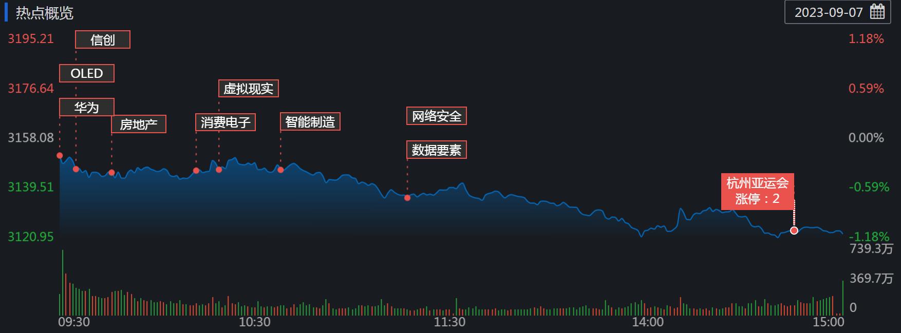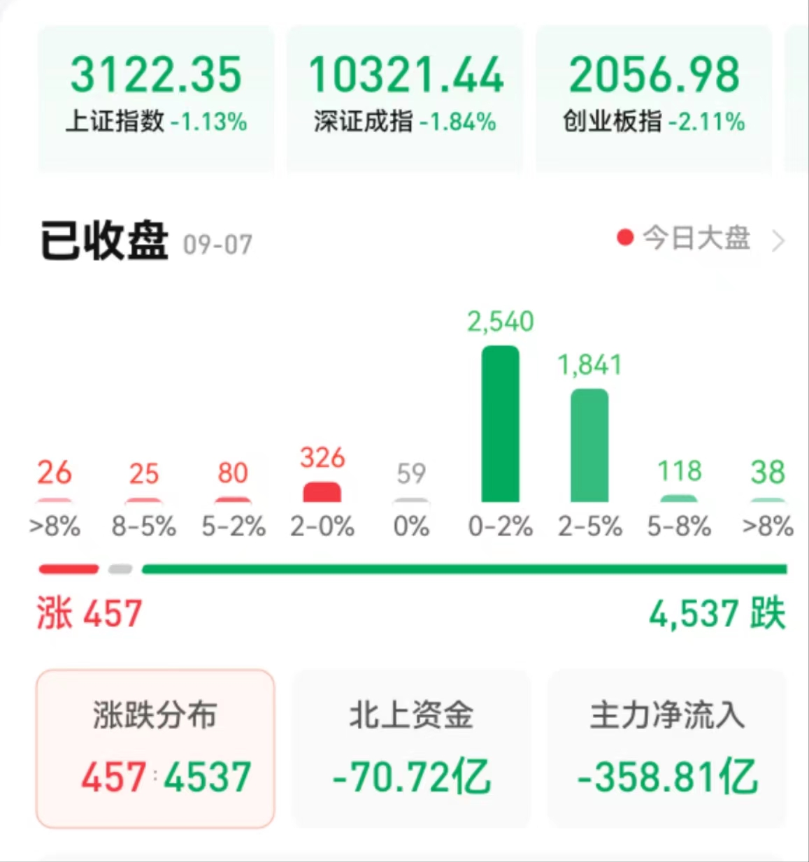 周四(9月7日),A股三大股指震蕩下行,全線飄綠。截至收盤(pán),上證指數(shù)跌1.13%報(bào)3122.35點(diǎn),深成指跌1.84%報(bào)10321.44點(diǎn),創(chuàng)業(yè)板指跌2.11%報(bào)2056.98點(diǎn);兩市合計(jì)成交7668.35億元,北向資金凈賣出70.72億元??傮w上看,兩市個(gè)股跌多漲少,超4500只個(gè)股下跌,上漲個(gè)股不到500只。其中,漲停個(gè)股達(dá)23只,跌停個(gè)股達(dá)4只。