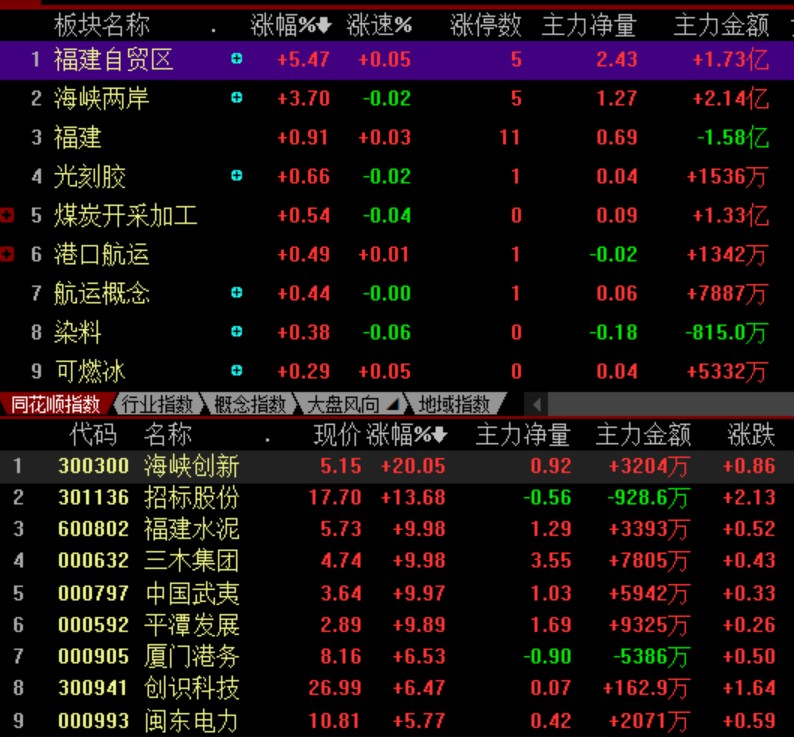 具體看,截至9月13日上午收盤,福建自貿(mào)區(qū)板塊強(qiáng)勢(shì)領(lǐng)漲,漲幅高達(dá)5.47%,海峽創(chuàng)新、福建水泥、三木集團(tuán)等多只個(gè)股漲停。