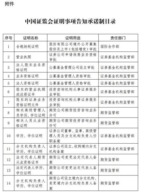 為深入貫徹黨中央、國務(wù)院重大決策部署,持續(xù)推進(jìn)“簡政放權(quán)、放管結(jié)合、優(yōu)化服務(wù)”改革,優(yōu)化證券期貨市場營商環(huán)境,6月4日,中國證監(jiān)會印發(fā)《中國證監(jiān)會關(guān)于推行證明事項告知承諾制的實施方案》(以下簡稱《方案》),按照最大限度利民便民原則,對相關(guān)行政事項涉及的共十四件證明事項實行告知承諾制。