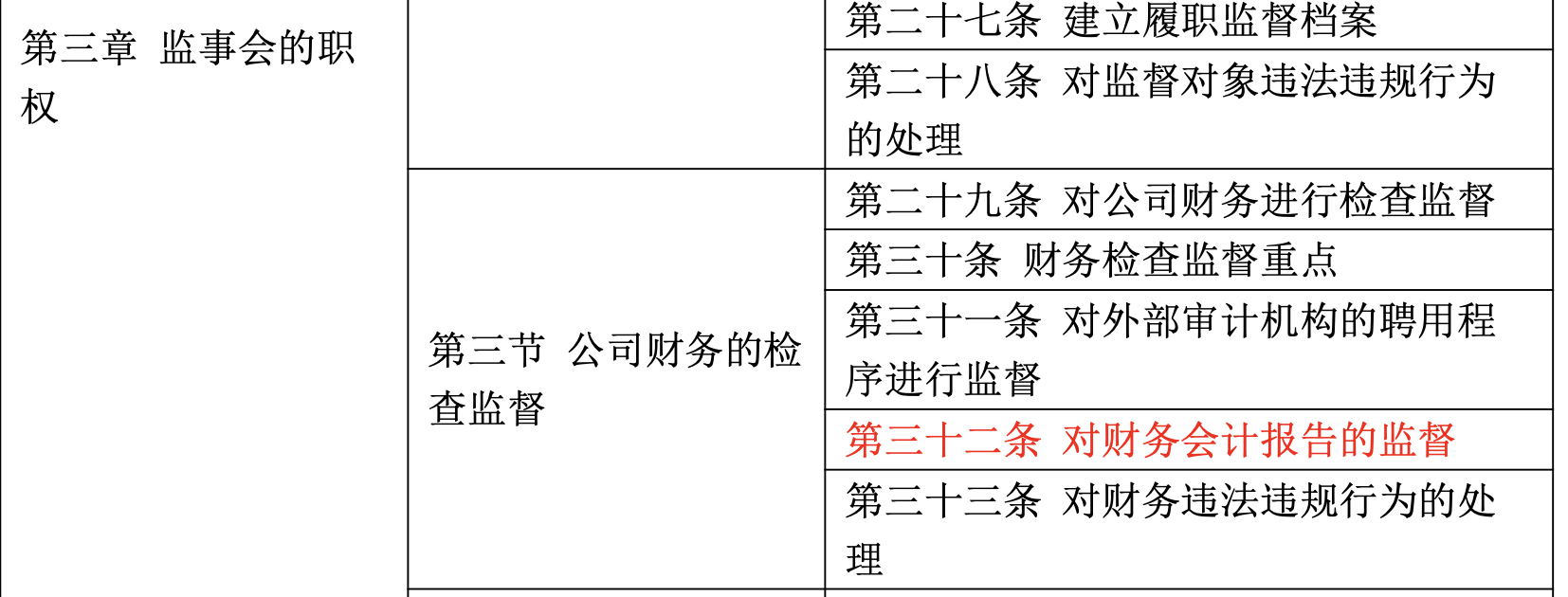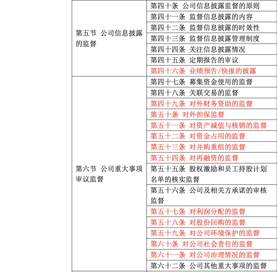 在增加監(jiān)管關(guān)注要點(diǎn)方面,根據(jù)近年來監(jiān)管關(guān)注要點(diǎn),《指引》增加相應(yīng)條目,如對財(cái)務(wù)會(huì)計(jì)報(bào)告的監(jiān)督;業(yè)績預(yù)告/快報(bào)的披露監(jiān)督;對外財(cái)務(wù)資助、對外擔(dān)保、資產(chǎn)減值與核銷、資金占用、并購重組、再融資、利潤分配、股份回購、公司環(huán)境保護(hù)、公司社會(huì)責(zé)任和公司治理情況的監(jiān)督等。