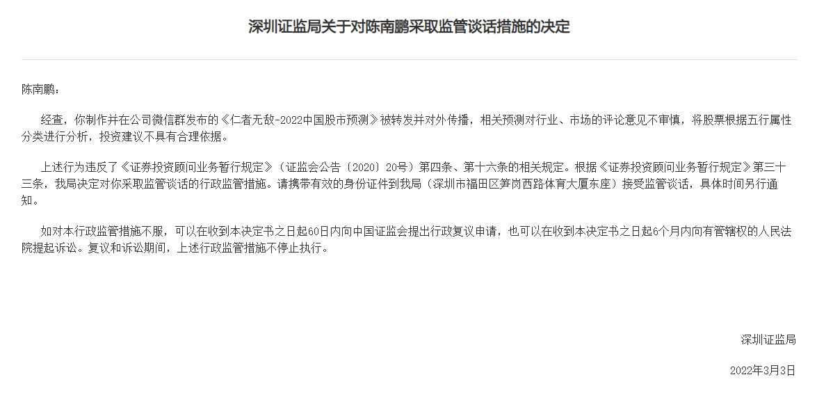 深圳證監(jiān)局表示,經(jīng)查,陳南鵬制作并在公司微信群發(fā)布的《仁者無敵-2022中國股市預(yù)測》被轉(zhuǎn)發(fā)并對外傳播,相關(guān)預(yù)測對行業(yè)、市場的評論意見不審慎,將股票根據(jù)五行屬性分類進行分析,投資建議不具有合理依據(jù),違反《證券投資顧問業(yè)務(wù)暫行規(guī)定》相關(guān)規(guī)定。深圳證監(jiān)局對陳南鵬采取監(jiān)管談話的行政監(jiān)管措施。