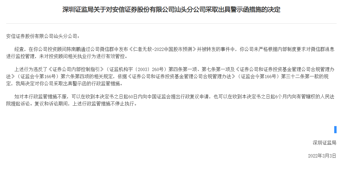 3月11日,深圳證監(jiān)局披露對安信證券汕頭分公司和公司投資顧問陳南鵬的監(jiān)管措施。原因是陳南鵬將股票根據(jù)五行屬性分類進行分析,制作并在公司微信群發(fā)布《仁者無敵-2022中國股市預(yù)測》的投資建議,該內(nèi)容被轉(zhuǎn)發(fā)并對外傳播,相關(guān)預(yù)測對行業(yè)、市場的評論意見不審慎。深圳證監(jiān)局認為該投資建議不具有合理依據(jù),而公司未對群消息嚴格管控,故對公司和陳南鵬均采取行政監(jiān)管措施。
