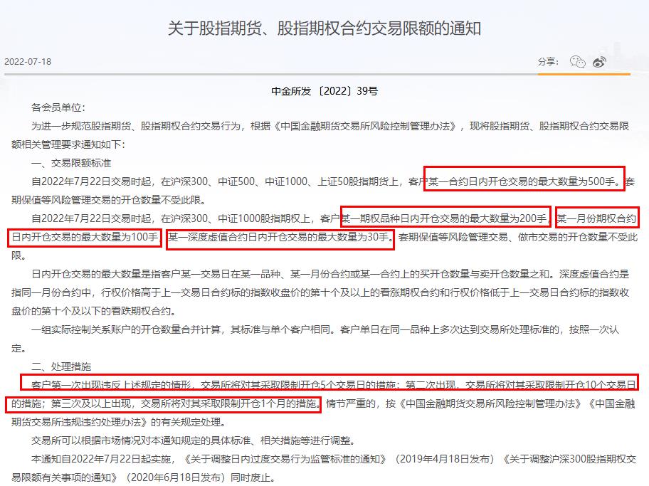 自2022年7月22日交易時(shí)起,在滬深300、中證500、中證1000、上證50股指期貨上,客戶某一合約日內(nèi)開倉(cāng)交易的最大數(shù)量為500手。套期保值等風(fēng)險(xiǎn)管理交易的開倉(cāng)數(shù)量不受此限。